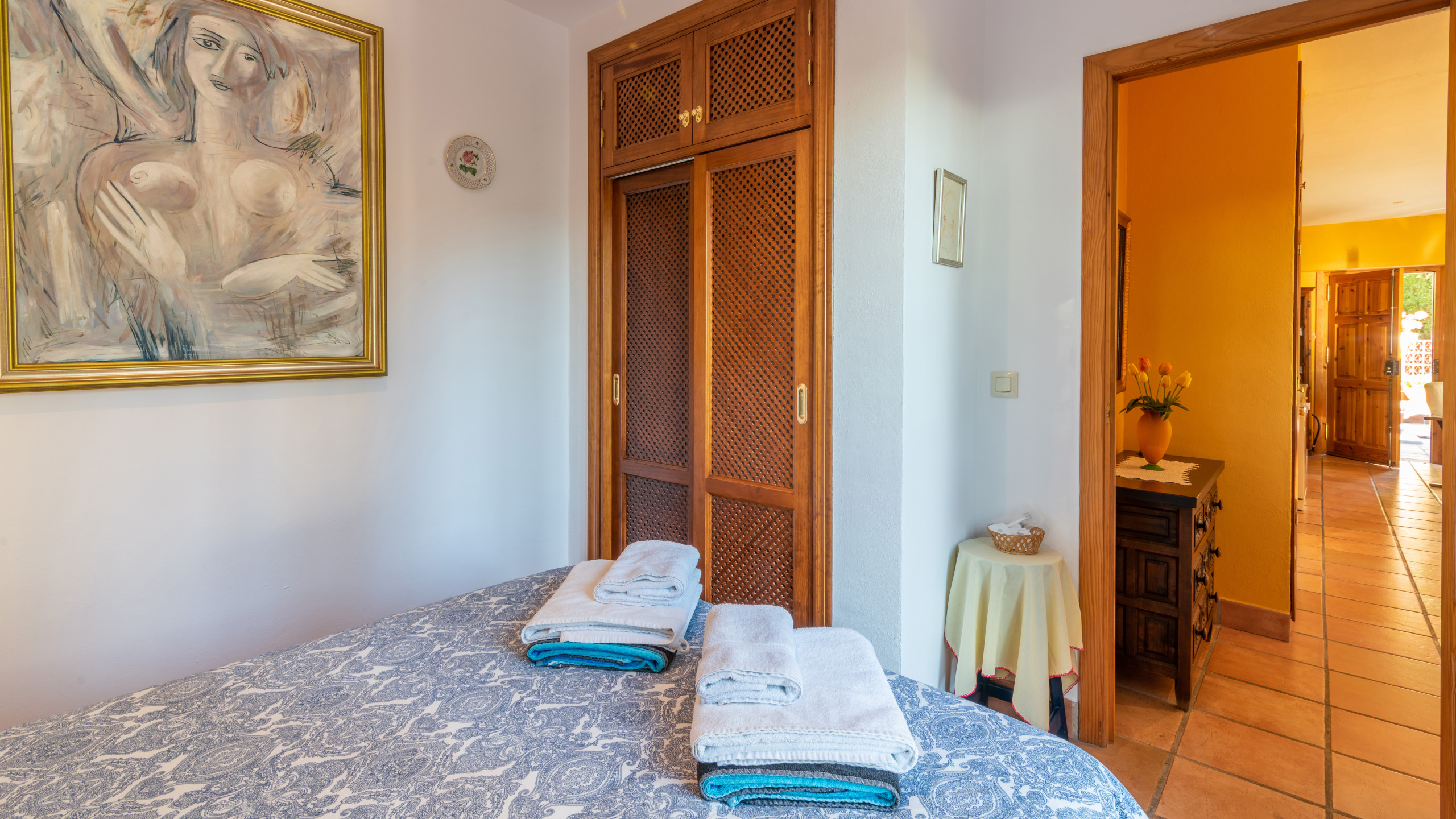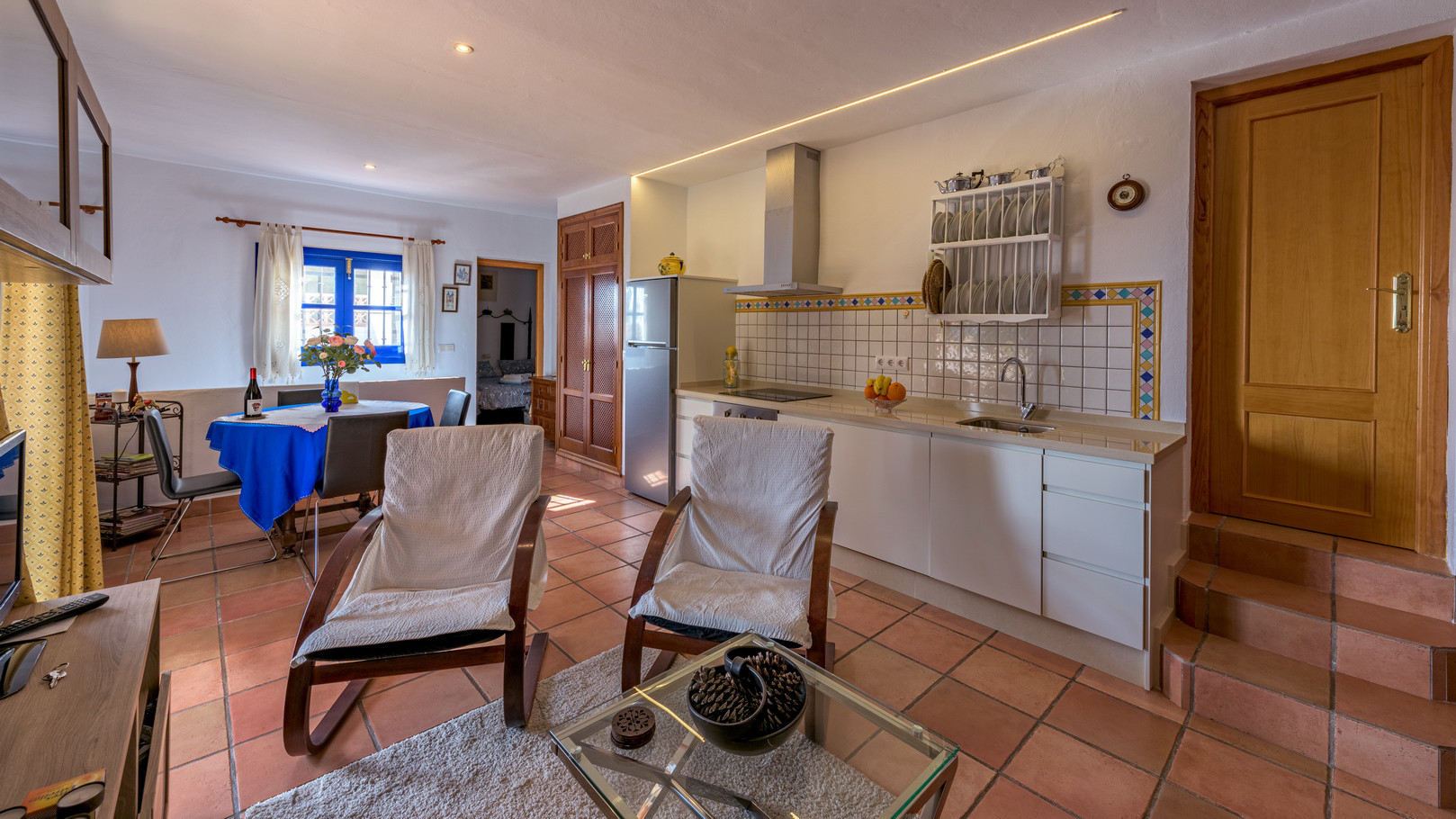 El comedor tiene vistas al patio de entrada. En la sala de estar hay un confortable sofá, un práctico y cómodo sillón, una mesa de centro, un aparador con televisión (con canales ingleses a su disposición), También hay una estufa de leña. El soleado dormitorio principal en la planta baja tiene una cama de matrimonio con mesitas de noche, armario y cómoda con cajones. La cama es de especial interés debido a su original cabecero, creado por un artista local que empleó para su fabricación hierro forjado a mano, madera y piedras preciosas. La habitación es muy luminosa gracias a una ventana que da a una zona privada del exterior y donde crece un viejo algarrobo (especie autóctona y protegida de la zona). Desde el salón, una escalera baja al segundo dormitorio con 2 camas individuales, armario y una librería con libros en inglés y español. Este dormitorio tiene el baño dentro. La cocina está completamente equipada.