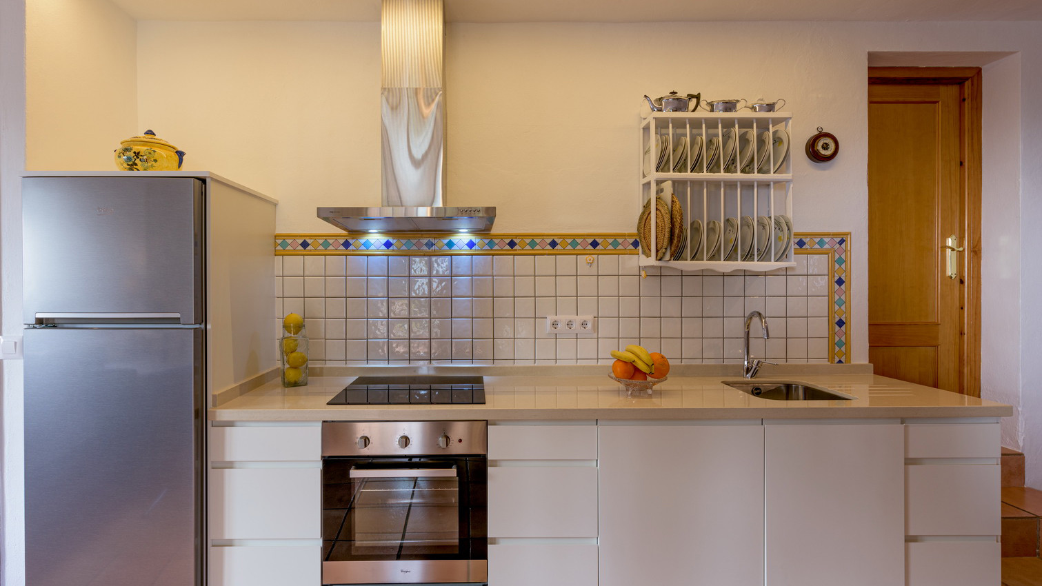 La entrada a la casita se hace por un espacioso y soleado patio construido con ladrillos hechos a mano. Dicha entrada se encuentra llena de macetas y tiene un pequeño jardín a la derecha. La puerta de madera (pintada en azul para que haga juego con los marcos de las ventanas y así dotarla de un aire auténticamente mediterráneo) nos conduce hasta el comedor, la cocina, sala de estar y cuarto de baño. Una gran puerta de cristal lleva a una amplia terraza con mobiliario de jardín y barbacoa. La terraza está cubierta con una pérgola y en ella disfrutará de unas preciosas vistas al mar, la campiña y las montañas. La posición de la terraza es ideal tanto para estancias veraniegas como invernales. La piscina privada es de agua salada y viene equipada con un sistema de purificación por ionización, libre de sustancias químicas y por tanto respetuosa con la piel y el entorno! Al final de la piscina hay un mosaico hecho a mano, elaborado por un artista local. El tema y nombre del mosaico es "Sol". El mobiliario exterior consta de tumbonas, una mesa y una amplia sombrilla.