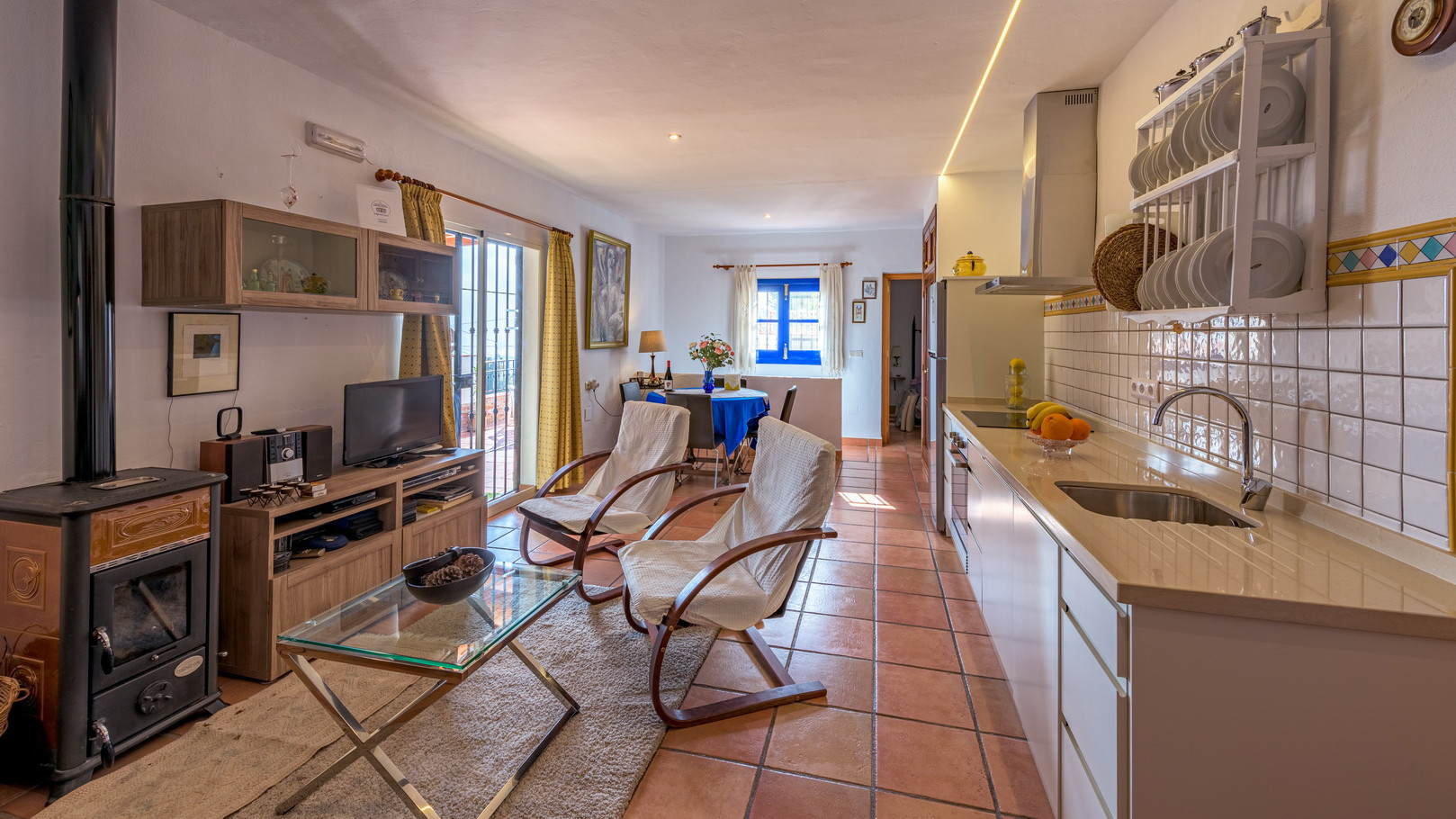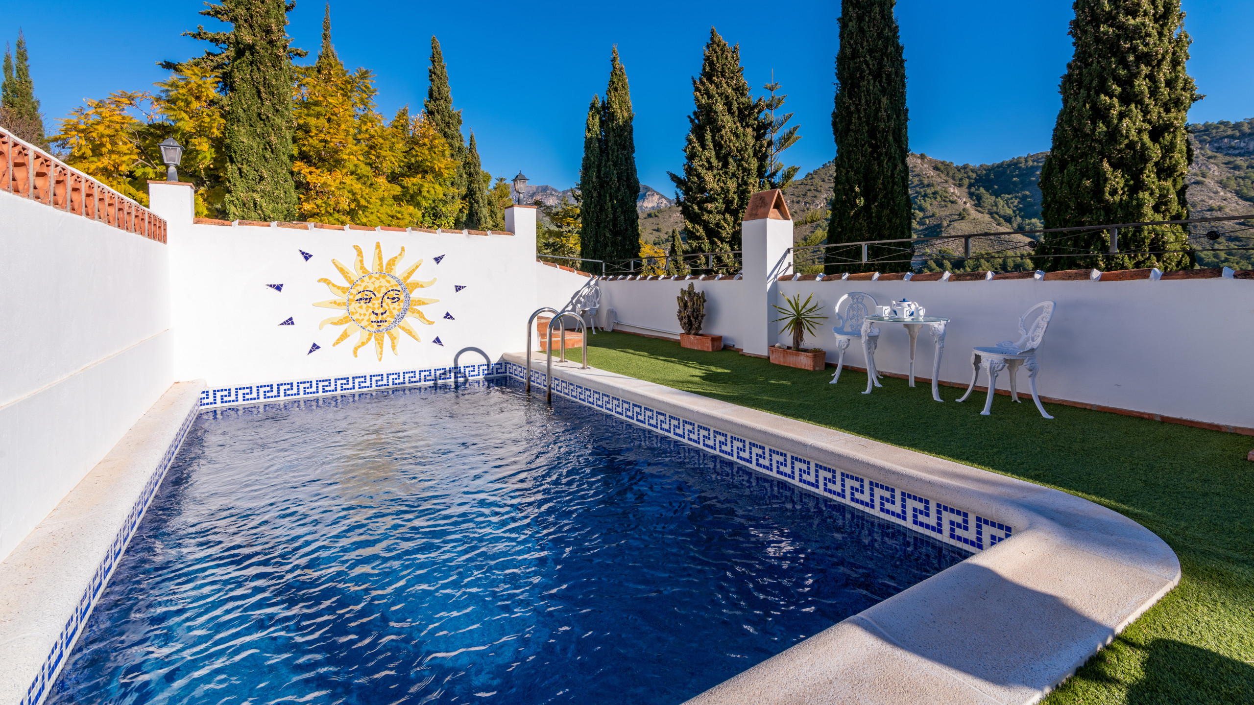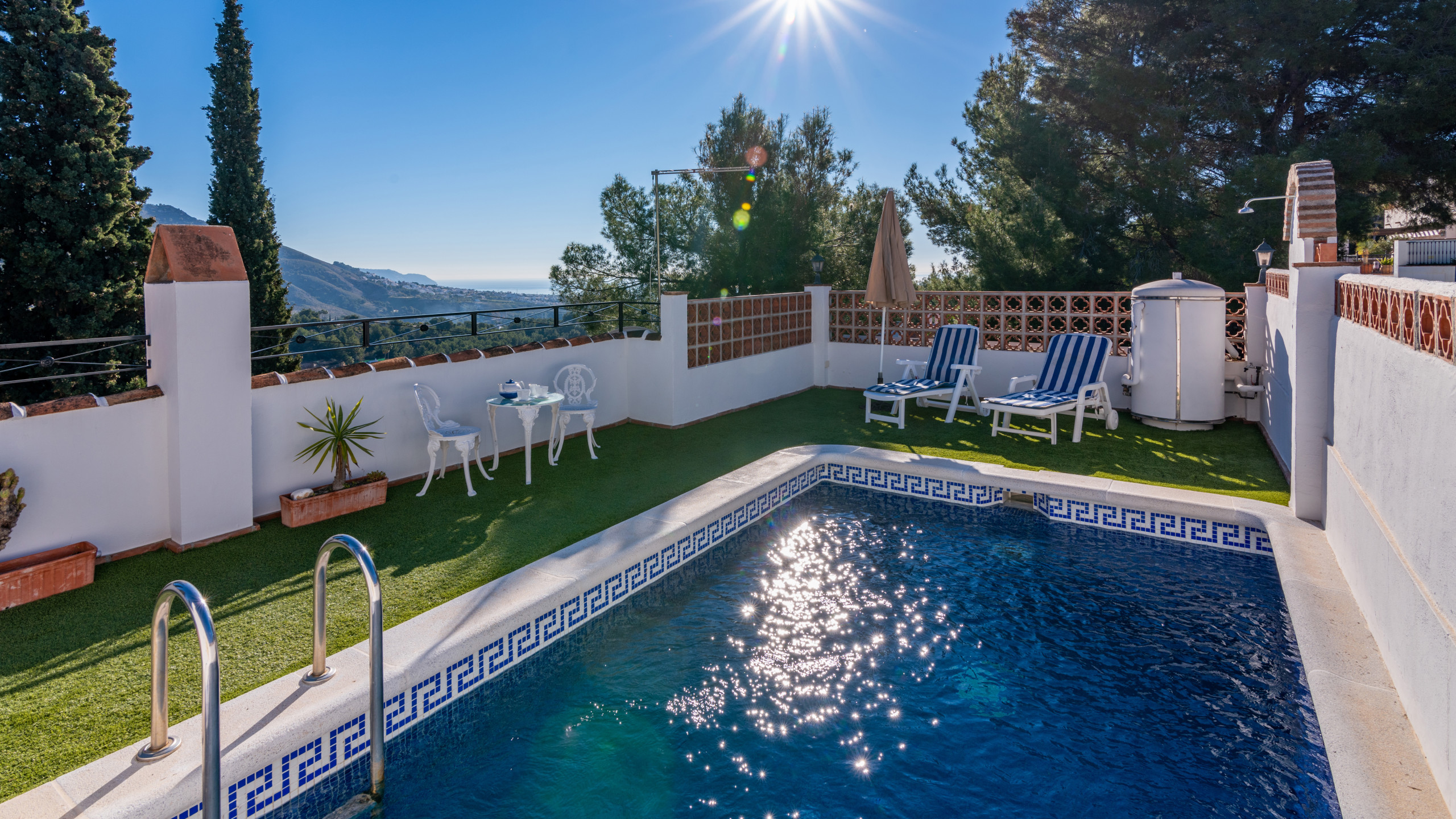 Esta casa es ideal para disfrutar de sus zonas exteriores; usted puede refrescarse en su propia piscina privada con escalones romanos (7 m x 3,8 m y 1,3 m - 1,75 m de profundidad), echarse una siesta a la sombra en la terraza o cocinar en la barbacoa las cenas al aire libre. ¡Parecerá que los días de sol nunca llegan a su fin! La villa tiene una ubicación tranquila en el campo, pero con buen acceso. Si usted es capaz de alejarse de este lugar de descanso, entonces puede visitar los hermosos pueblos circundantes o la grandeza del espléndido Palacio de la Alhambra en Granada. Para salidas nocturnas, Nerja ofrece una excelente selección de restaurantes, bares de tapas y oportunidades para ir una fiesta.