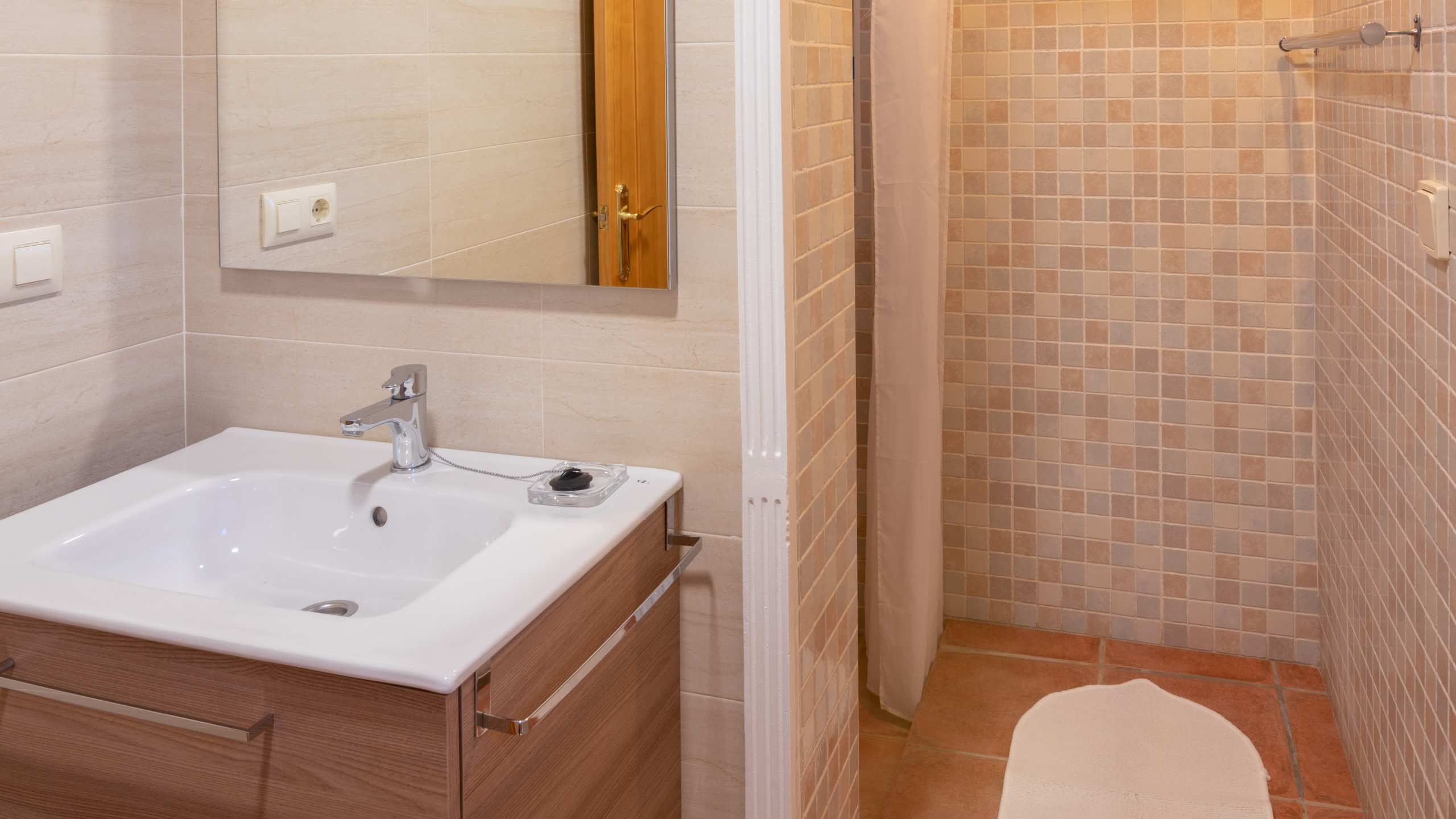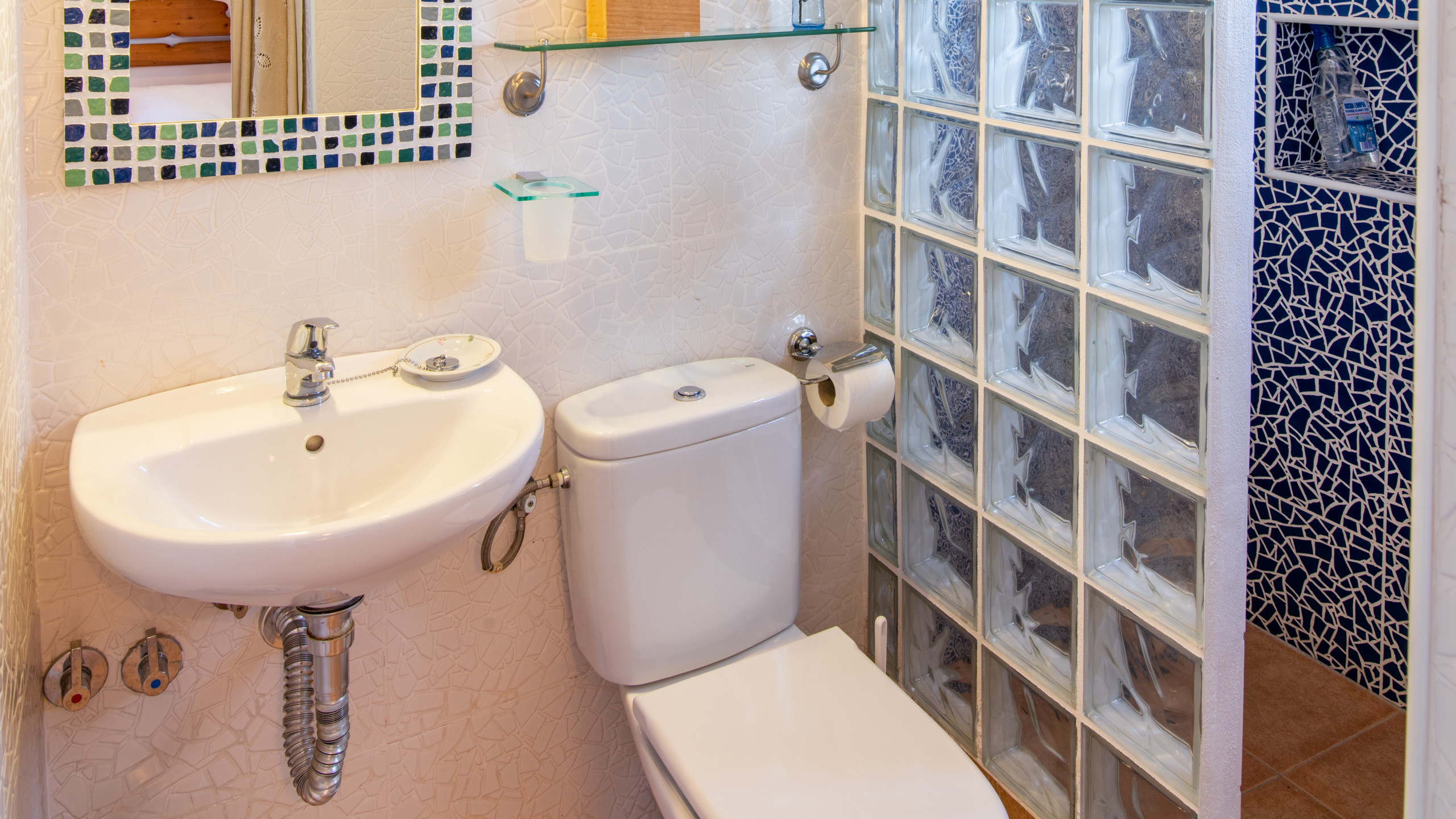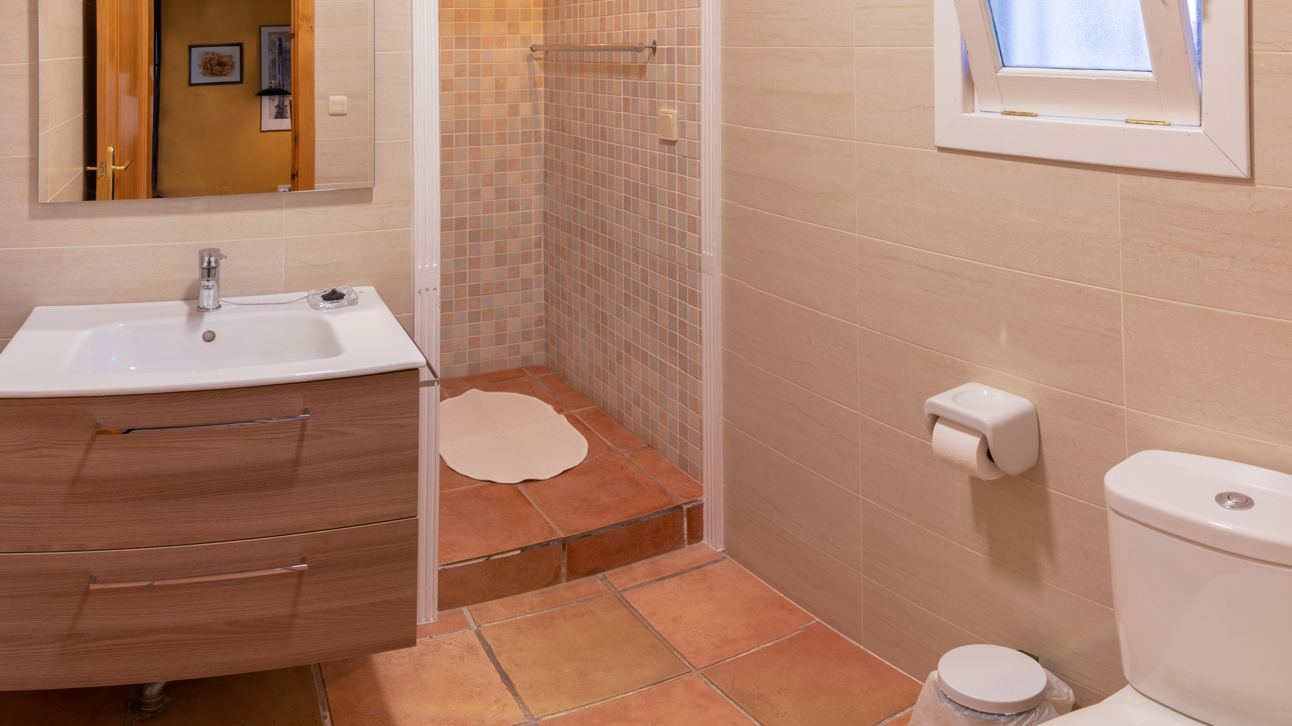 El cuarto de baño está decorado con azulejos terminados a mano y consta de lavabo, inodoro y ducha ( también hay a su disposición un secador de pelo). El agua se calienta mediante placas solares. La lavadora está situada en el cuarto lavadero. La casita también cuenta con atractivos extras como: aire acondicionado (frío/ caliente), caja fuerte y acceso a Internet de banda ancha para huéspedes que traigan su propio portátil (sin coste adicional). Además de todo lo anterior, nuestros invitados también disfrutarán de plaza de parking privada.