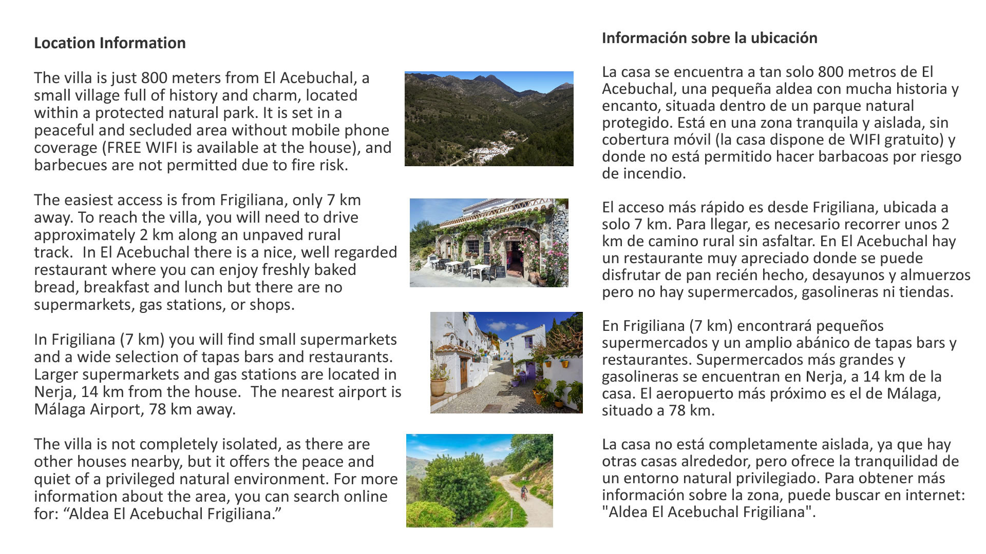 Hoy en día, El Acebuchal es un remanso de paz sin tiendas, pero con un reconocido bar-restaurante que sirve platos locales tradicionales como caza, jabalí y cabra. El acceso se realiza por una carretera de montaña serpenteante, con los últimos 2 km de pista sin asfaltar. En Frigiliana encontrará pequeños supermercados, muchas tiendas y una amplia selección de bares de tapas y restaurantes. Supermercados más grandes y gasolineras se encuentran en Nerja, a 14 km de la casa.
