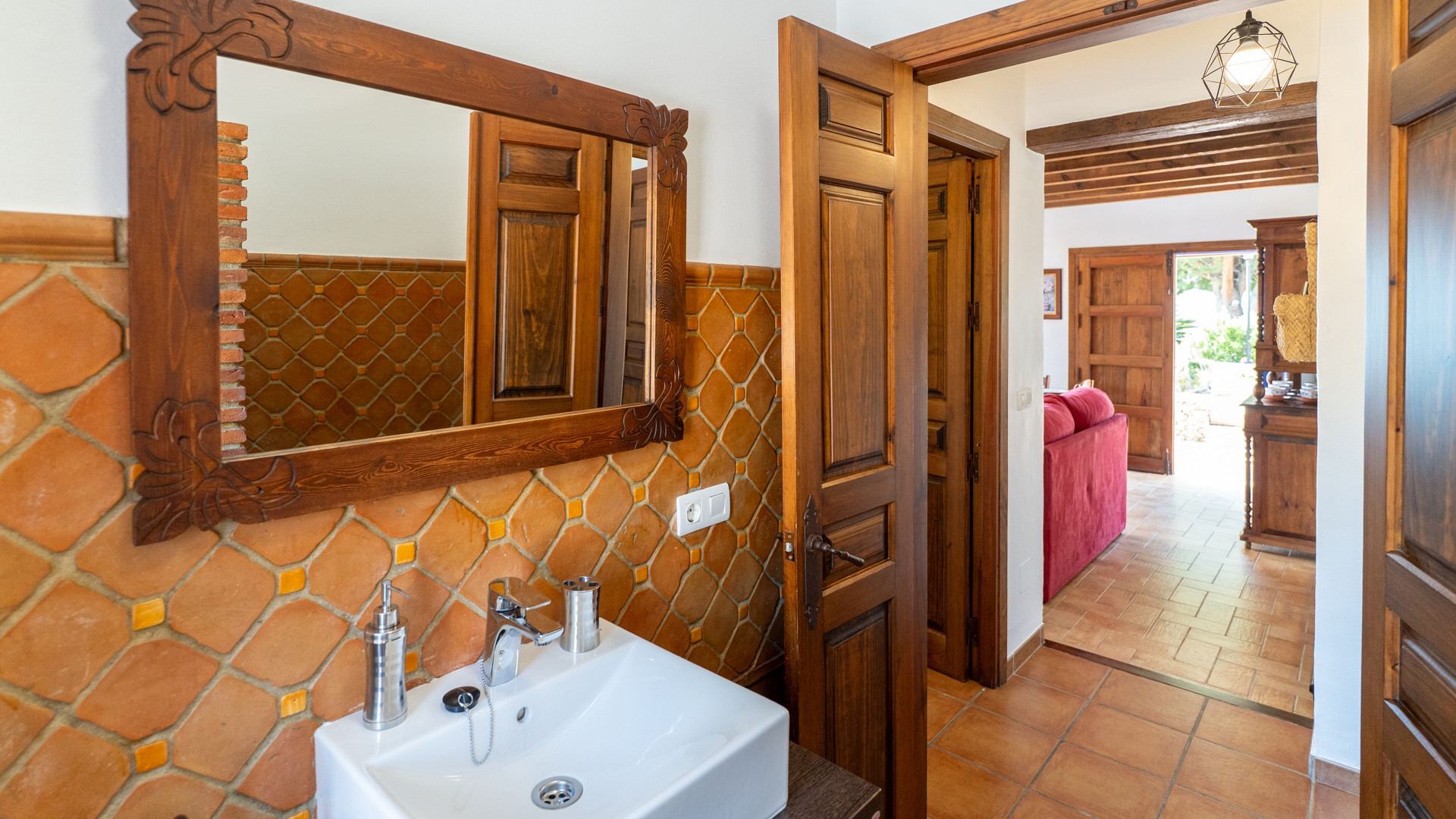 Con todas las habitaciones en la planta baja, esta casita ha sido amueblada con gran gusto y decorada al estilo rústico andaluz. La zona de vivienda se encuentra abierta a una amplia cocina y a una sala de estar con televisión, equipo musical y estufa de leña. Toda la estancia se beneficia de techos altos, dando la sensación de espacio y frescor en los calurosos días de verano. Amplios ventanales (con mosquiteras) y una puerta acristalada dan a la sombreada galería. La cocina está completamente equipada y cuenta con placa vitrocerámica de 4 fuegos, horno eléctrico, microondas, lavavajillas, frigorífico/congelador, vinoteca y cafetera. La lavadora se encuentra en un cuarto de servicio. La casita cuenta con dos dormitorios, (uno con cama de matrimonio y otro con dos camas individuales) y un cuarto de baño con ducha, WC y lavabo.