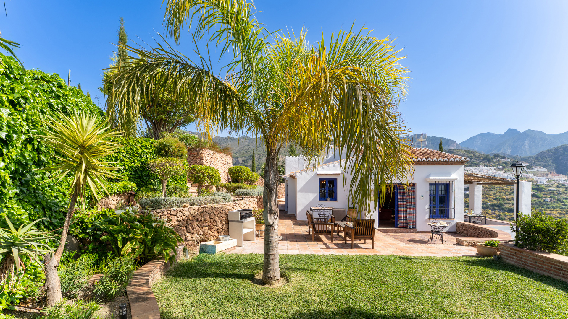 Situada en el campo a tres kilómetros y medio de Frigiliana, esta casita se ofrece como un confortable y apacible retiro para una pequeña familia. El jardín, que incluye una pequeña zona de césped y un estanque en el acceso a la puerta principal, está plantado con flores, arbustos y árboles frutales. La piscina con forma de riñón (7 X 3 m) está emplazada en un íntimo rincón de la terraza y se complementa con una ducha, mobiliario de jardín y sombrillas para el sol. La galería de la fachada este, accesible directamente desde la zona de la piscina y también desde una puerta acristalada situada en la sala de estar, es el lugar perfecto para echarse una siesta a la sombra o para sus barbacoas. Las playas de Nerja (7,5 km) están a sólo 10-15 minutos en coche.