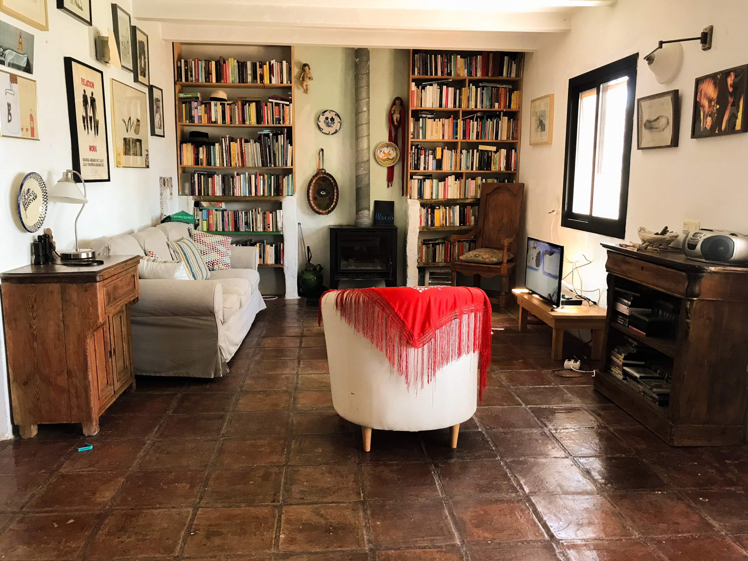 En el salón principal se refleja aún más la personalidad del propietario, con cuadros originales, toques creativos y una amplia colección de libros, todo integrado en un ambiente cálido de casa de campo.