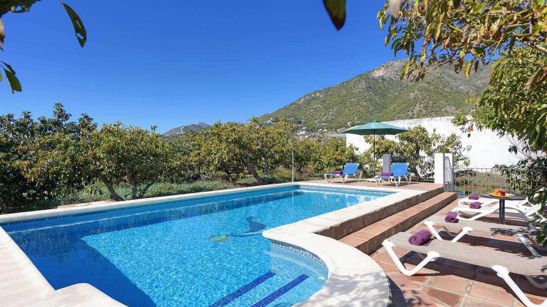 Un oasis de tranquilidad rodeado por campos de aguacates, a sólo 5 minutos en coche de Frigiliana (1,2 km). También se coger un atajo e ir andando en 15 minutos. O si es sólo para cenar... hay un buen restaurante a 5 minutos andando. La playas de Nerja están a 7 kilómetros de distancia, por lo tanto es una casa ideal para los que quieren combinar una estancia pacífica en el campo con algunos días de playa. La terraza delante de la casa está orientada al sureste y tiene un sombreado porche con techo de cañas. Desde aquí disfrutará de excelentes vistas sobre el campo y el Mediterráneo %u2013 con todo esto, es el lugar perfecto para disfrutar las comidas en el exterior. Hay barbacoa. La atractiva piscina privada (10 m x 5 m) esta situada detrás de la casa en un nivel superior (hay varios escalones) y, como está rodeada por aguacates, ofrece completa privacidad. Tumbonas, sombrillas y mobiliario de jardín están incluidos. La propiedad tiene su propio acceso y amplio parking. Se llega a través de un camino hormigonado.
