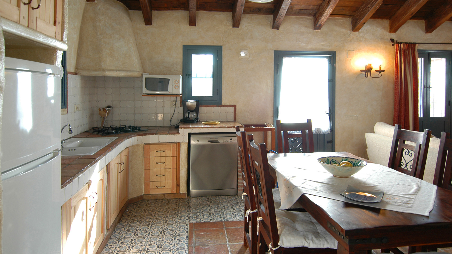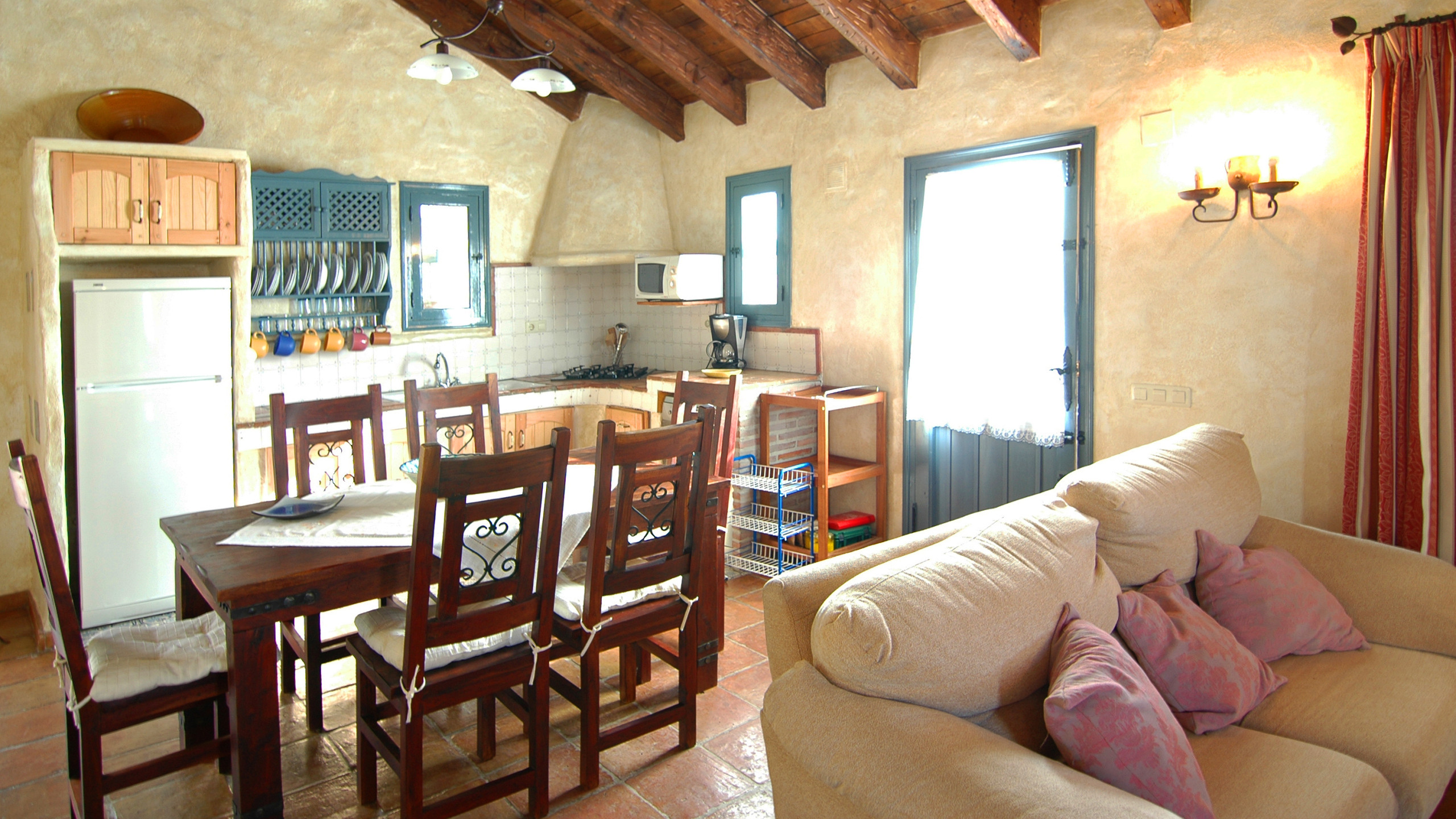 La entrada principal da acceso a un amplio salón-comedor equipado con estufa de leña, Smart TV, reproductor de DVD, equipo de música y aire acondicionado. La cocina abierta está completamente equipada con placa de gas de 4 fuegos, microondas, frigorífico/congelador y lavavajillas. La lavadora se encuentra en el exterior.