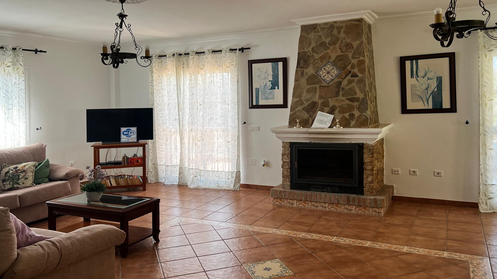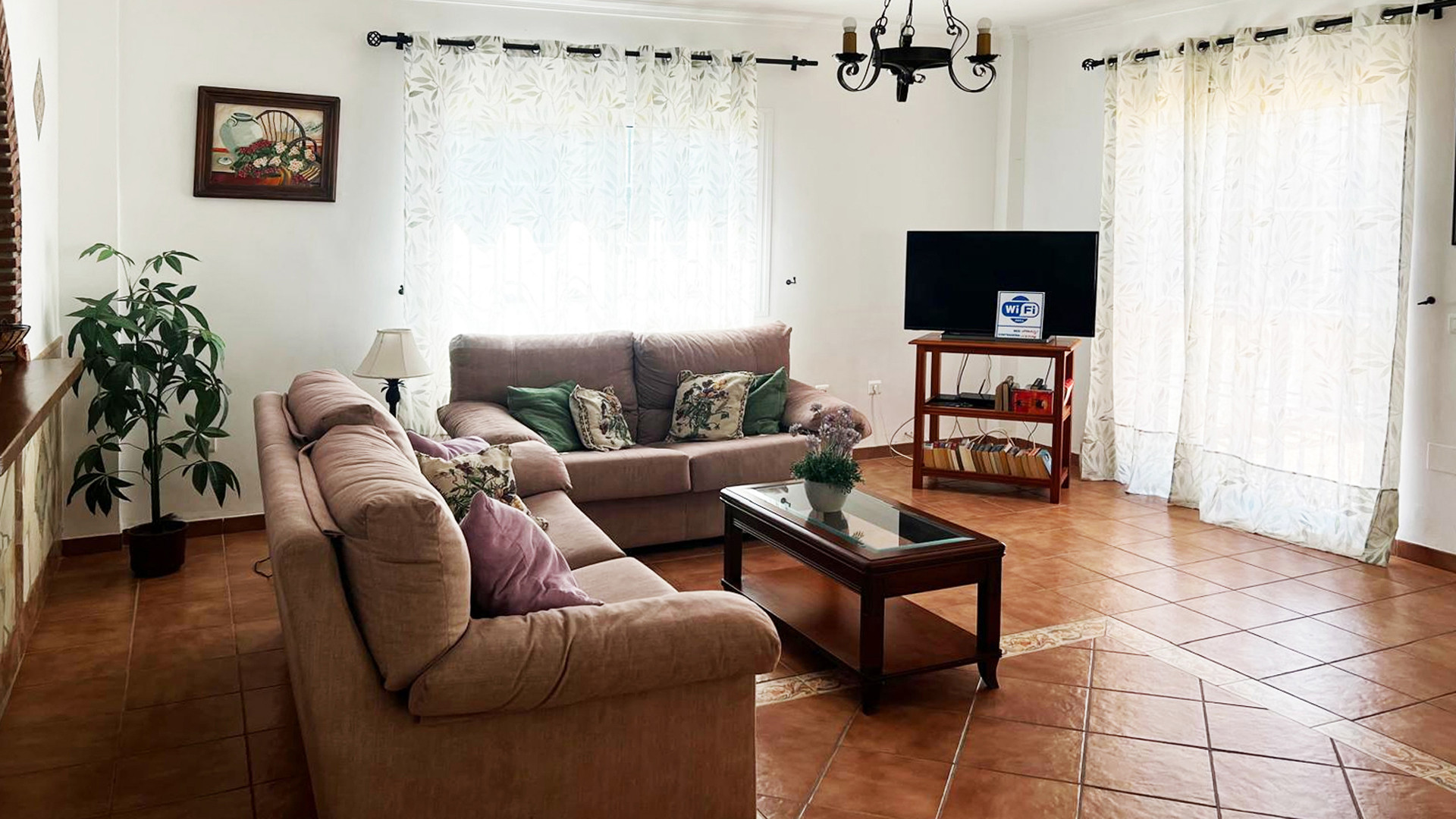 La villa ofrece un alojamiento espacioso, todo en una sola planta, con decoración al estilo español clásico. En la planta baja encontrará un acogedor salón-comedor con dos sofás, chimenea y televisión por satélite. Una barra americana separa la cocina bien equipada con vitrocerámica, horno eléctrico, microondas, frigorífico/congelador, lavadora y lavavajillas del salón. El dormitorio principal cuenta con cama de matrimonio y cuarto de baño privado, dotado de bañera/ducha, lavabo y WC. Otro de los dormitorios con cama doble también posee baño privado compuesto por ducha, lavabo y WC. El tercer y cuarto dormitorio son dormitorios con dos camas individuales cada uno. Un tercer cuarto de baño completo está destinado para su uso compartido.