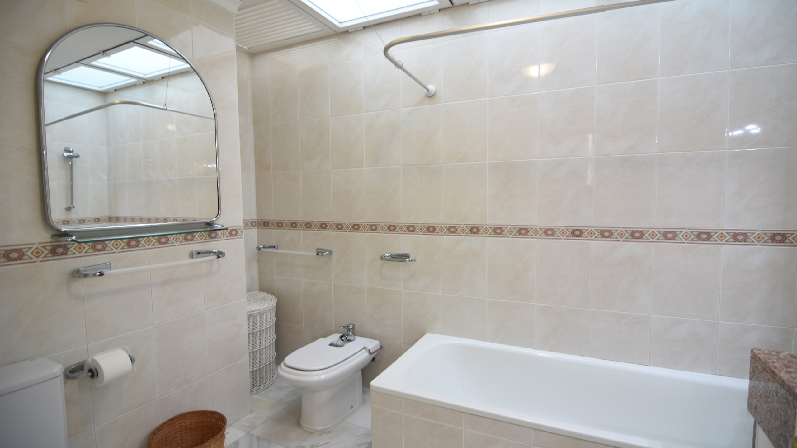 En la primera planta encontrará un espacioso dormitorio de matrimonio con una amplia terraza privada. El segundo dormitorio es doble con dos camas individuales. El tercer dormitorio de esta planta es muy pequeño y está compuesto por un cama litera y no tiene armario. Por este motivo pensamos que es solo adecuado para dos niños. También encontraremos un cuarto de baño completo con bañera, WC, bidé y lavabo.